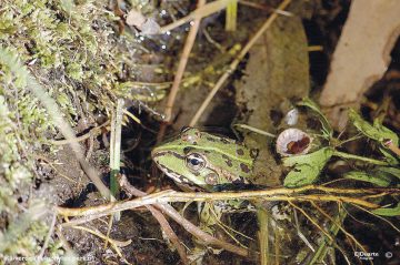 Pode ser vista no nosso Parque do Rio Ul nos charcos e lagos permanentes ou temporários, de água doce. É uma rã de tamanho medio a grande, corpo esguio e pernas longas, podendo as fêmeas, que são em geral mais corpulentas que os machos, alcançar os 11 cm de comprimento. Apresenta uma coloração verde a acastanhada, muito variável entre indivíduos, com manchas negras, mas com uma linha vertebral verde mais clara e sem a característica mancha temporal das rãs cinzentas. A região ventral é de coloração cinzento-esbranquiçada. O tímpano é conspícuo e as pregas glandulares dorso-laterais são moderadamente desenvolvidas, de coloração acastanhada. Apresenta quatro dedos nas extremidades anteriores e cinco nas posteriores, unidos por membranas interdigitais muito desenvolvidas. A pupila ocular é horizontal. Os machos apresentam sacos de coloração acinzentada nas comissuras da boca. Alimentam-se essencialmente de insetos. O período reprodutor abarca o período que vai de Abril a Julho, ocorrendo principalmente em massas de água permanentes. As fêmeas podem desovar entre 2.000 e 7.000 ovos por estação reprodutiva, com uma média de 2.300, que aderem à vegetação e ao substrato, mas que também podem por vezes ser encontrados a flutuar na água. Emergem do ovo em cinco a oito dias e a metamorfose começa decorridas oito a doze semanas, embora alguns girinos possam passar o inverno nesse estado. A perda de habitat, especialmente por secagem de massas de água, construção e edificação e a excessiva contaminação das águas, são ameaças que começam a suscitar preocupação, com a sua diminuição evidente.