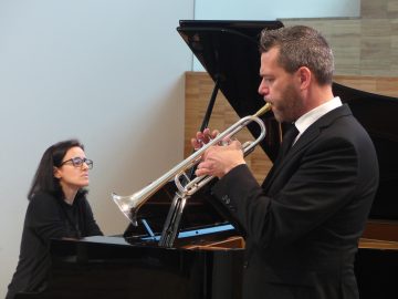 O Diptyque Duo, composto pelo trompetista António Silva e pela pianista Ana Filipa Sousa, subiram ao palco do Auditório Marília Rocha no primeiro domingo de Abril, cumprindo mais um concerto do ciclo AcáMúsica – ciclo de concertos comentados, que se realizam a cada primeiro domingo de cada mês, pelas onze horas. Segundo José Luís Postiga, investigador do Inet-MD e professor da Academia de Música de São João da Madeira, responsável pelos comentários deste ciclo de concertos, o sol que atravessou as janelas do auditório iluminando todo o espaço, preparam a plateia para um repertório em que as sonoridades quentes do trompete, envolvidas no abraço de um piano de registo cheio foram uma constante ao longo dos 50 minutos de duração do evento. O concerto foi dedicado a música norte americana do século XX escrita para esta formação, representada por obras dos compositores Eric Ewazen, Joseph Turrin e Kevin Mackee, cumprindo uma abordagem global a diferentes sonoridades, técnicas e registos dos instrumentos. A excelência dos executantes ficou patente quer nas exigentes passagens de grande virtuosidade técnica do Capriccio de J. Turrin, ou do Roaring Gunnison, segundo e último andamento da programática obra de K. McKee, Centennial Horizon, mas também no melodismo imposto pelo primeiro andamento desta obra, Aspes Grove, ou na Ballade for a Ceremony – A marriage ballade, de E. Ewazen, peça com que se iniciou o concerto. Contudo, foi na Sonata para trompete e Piano de Ewazen que o ‘díptico’ mostrou de forma mais evidente como a individualidade de cada elemento se funde de forma perfeita numa peça única, neste caso particular, numa complementaridade de sonoridades que dialogam, interagem, se integram e afastam, cumprindo o objetivo máximo do que se propõem ser a denominada música de ‘câmara’. No global, a contemporaneidade do repertório procurou sempre o compromisso de trazer música de hoje, feita por compositores de hoje, que se integram facilmente nos trâmites de todos os tipos de plateia, mais ou menos especializados, onde não se esquece os entusiastas estudantes e profissionais dos instrumentos, sempre em busca daquela passagem particularmente difícil, resolvida com elevada mestria, nem aqueles que relembram nas harmonias as aproximações aos sons do cinema, ou dos clubes de jazz norte americanos. O encore pedido pelo público demonstrou que a mensagem ‘quente e solarenga’ envolveu todos de forma particular, tendo o Diptyque agradecido com o curto mas caloroso Rondo for Lifey de Leonard Bernstein.