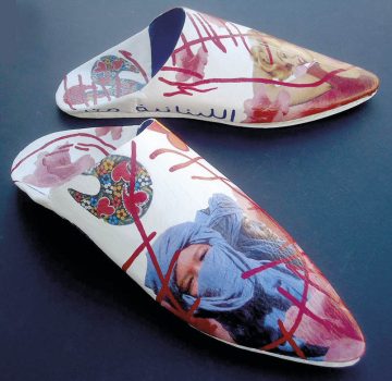 São trabalhos de 19 mulheres artistas portuguesas e espanholas, “cada uma com um ponto de vista particular sobre a temática”, que intervieram sobre um par de babuchas masculinas, “calçado utilizado no seio de uma família tradicional árabe e que, neste contexto, se pretende que personifiquem o Homem”, como informa o Museu do Calçado.