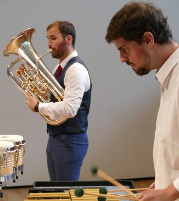 Por entre cada elemento de repertório, foi o próprio duo o responsável pelo comentário ao concerto, procurando um adequado enquadramento estético das obras, realçando os elementos sonoros que permitiam conduzir o discurso musical. Esta postura revelou-se particularmente interessante nas peças que utilizavam técnicas instrumentais estendidas, ou seja, que resultam de formas de execução menos comum, como no caso das cinco peças que edificam os “Alicerces Japoneses” do jovem compositor Francisco Ribeiro, numa estética mais contemporânea, onde o eufónio deambulou entre os sons areados sem definição de altura, à mistura de canto e vibração labial, vulgo multifónicos, procurando a cada passo uma referência melódica que se fundisse na harmonia pentatónica que remete para a orientalidade, presente sobretudo na poética do vibrafone. Depois, o discurso foi gradualmente se aproximando de sonoridades mais ou menos jazzísticas, europeias, do sul e norte da América, fruto das obras de Paulo Perfeito, cuja “Good Vibes” antecedeu a melancolia de “Água e vinho” de Egberto Gismonti, num arranjo de Francisco Ribeiro, e seis das dez “Diminutives” de Nathan Daughtrey, peças de um minuto compostas pelo compositor/percussionista americano durante o ‘lockdown’ de 2020. A viagem terminou com duas referências à cidade do Porto, mencionada como ponto de conexão do duo, com referência à paisagem das suas margens, feita por Álvaro Silva em “Prelúdio (pelas margens do rio douro)”, pinceladas por sonoridades quase impressionistas criadas pelas harmonias articuladas do vibrafone e pela sustentação melódica do eufónio. Depois viveu-se a cidade, pela obra de Telmo Marques “Scenes from the city”, percorrendo diferentes sensações sonoras que tentaram transportar a plateia para o parque, as ruas, a noite, a vida da cidade. Uma quase ‘volta ao mundo’ em 60 minutos que, fruto da criteriosa escolha de repertório feita pelo duo e pela abordagem comunicativa usada, se revelou eficazmente apropriada para reconfortar uma manhã que havia nascido friamente outonal.
