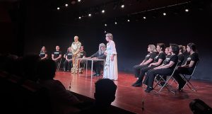 A narrativa levou o público numa viagem improvável pela Europa, acompanhando a personagem Madame Butterfly na sua busca pelo prémio, até um desvio inesperado que culmina numa aterragem em Aveiro, a “Veneza de Portugal”. A partir daí, o espetáculo ganhou contornos paródicos, incluindo uma recriação humorística de Romeu e Julieta, aqui reinventado com novas personagens e em colaboração com alunos e docentes do Agrupamento de Escolas Oliveira Júnior.