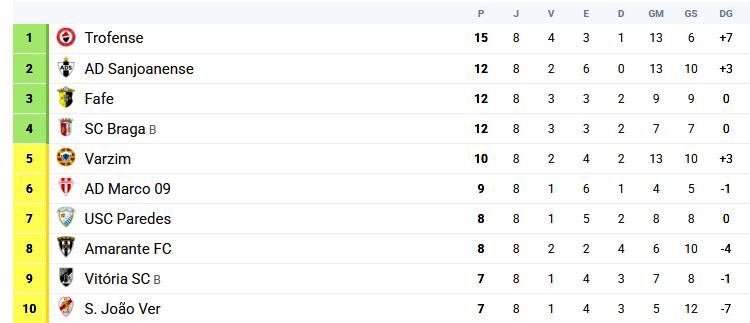 Liga 3 - 8ª jornada – Série A Estádio Conde Dias Garcia Árbitro: Halim Shirzad Árbitros assistentes: Rafael Escudeiro e César Soares Quarto árbitro: João Veríssimo AD SANJOANENSE: João Monteiro; Sebastian Mosquera (Rúben Cardoso, INT), Janico, Nando e Filipe Maio; João Daniel (CAP.) (Edu Pinheiro, INT), Vasco Gomes (Kiko Félix, 56’) e João Couto (Tipote, 78’); Miguel Lopes, Talles Wander e Federico Cezar (Sérgio Mosquera, 83’) Suplentes não utilizados: André Duarte, Alan Caló, Rui Santos e Lucas Correia Treinador: Juan Cruz Disciplina: cartão amarelo para João Daniel (44’), Sebastian Mosquera (45+2’) e Talles Wander (74’) e cartão vermelho para Kiko Félix (83’) VARZIM SC: Pedro Costa; Pedro Nuno, Derick e Rodrigo Rego (Pimenta, 37’); Luís Oliveira (Sequeira, 58’), Rúben Oliveira (CAP.), França e Talocha; Dani Benchi (Hircane, 58’), Zé Manuel (Rebelo, 58’) e Clemente (Gonçalo Teixeira, 74’) Suplentes não utilizados: Momo Mbaye, Milhazes, Boloto e Miguel Vila Cova Treinador: Álvaro Madureira Disciplina: cartão amarelo para França (60’), Pedro Costa (67’), Talocha (74’), Rodrigo Rego (76’) e Rúben Oliveira (90+1’) Golos: 0-1 por Clemente (10’), 1-1 por Federico Cezar (45+1’), 2-1 por Talles Wander (68’), 2-2 por Rebelo (72’), 2-3 por França (74’), 3-3 por Edu Pinheiro (90+6’)