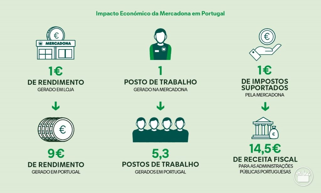 Além disso, a marca contribui com 9 euros para a economia portuguesa por cada euro de receitas geradas nas suas lojas (salários, rendas e lucros). Da mesma forma, por cada posto de trabalho criado na Mercadona são criados 5,3 empregos no País. Em termos de impacto fiscal, cada euro efectivamente suportado pela Mercadona traduz-se em 14,5 euros de receita fiscal para os diferentes níveis das administrações públicas portuguesas.