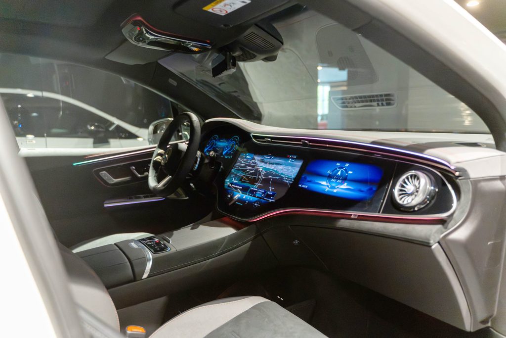 O modelo também pode ser encomendado com o MBUX Hyperscreen (opcional), em que três displays são combinados praticamente sem descontinuidade para dar origem a um único display e criar uma faixa de ecrã com mais de 141 cm de largura. Está disponível um display OLED de 12,3 polegadas para o próprio passageiro dianteiro no EQE SUV. O sistema utiliza uma lógica de bloqueio inteligente com recurso a uma câmara para detetar se o condutor está a olhar para o display do passageiro dianteiro. Se for este o caso, o sistema escurece automaticamente o conteúdo por razões de segurança.