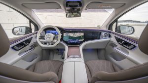 O luxuoso e espaçoso habitáculo vem equipado, em opção, com o MBUX Hyperscreen, que foi apresentado no EQS. Trata-se de três displays combinados quase sem descontinuidade para dar origem a um único display e criar uma faixa de ecrã com mais de 141 cm de largura, e que inclui o painel de instrumentos com 12,3 polegadas, o ecrã central de 17,7 polegadas e um ecrã de 12,3 polegadas para o passageiro. Os dois últimos são táteis e com tecnologia OLED. No que diz respeito à navegação com inteligência elétrica, o nome diz tudo. Com base em vários fatores, o sistema planeia o percurso mais rápido e conveniente, incluindo paragens para carregamento. O sistema também reage dinamicamente, por exemplo, no caso de congestionamentos de trânsito ou de mudanças do estilo de condução.