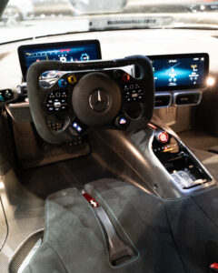 Mesmo parado, o modelo impressiona. Durante a apresentação exclusiva, os convidados puderam observar pormenores únicos do Mercedes-AMG ONE, como o “ritual” de ignição do motor, o sistema de elevação da carroçaria e o acionamento dos ailerons e grelhas de refrigeração — detalhes que reforçam o ADN competitivo do automóvel.