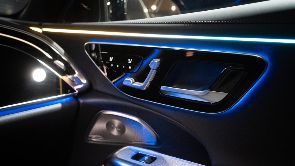 Aí encontra-se o tablier com MBUX Superscreen (semelhante ao MBUX Hyperscreen). Este sistema que fornece informação aos três ecrãs e permite fazer vídeo-chamadas, utilizar jogos e redes sociais, algumas das várias possibilidades potenciadas pela conectividade 5G do modelo.