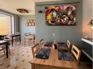 Também há sempre exposições de artistas, preferencialmente da região. Como estivera ligado às artes — foi produtor de luz e som, o que teve de deixar devido a um problema nos ouvidos — Tiago coloca tipos de iluminação diferentes na entrada, onde está o forno, e no interior, onde estão as mesas e exposições.