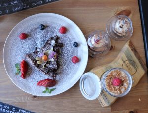 Nas sobremesas, pode ficar Perdido por cem, Perdido por mil (semi-frio de baileys com café, com crumble) ou culpar a vontade. A culpa é da vontade foi o nome adotado para o cheesecake, por ser um trecho de uma música de António Variações que ambos adoram. Além da Carinha Laroca, Um Olho no Camarão e outro na Pizza (molho especial, queijo, camarão, coentros) e Heróis do Mar (molho especial, queijo, frutos do mar, salmão fumado, alcaparras) são as que têm mais saída.