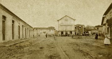 A “viagem no tempo” em vários capítulos que vos propomos iniciar agora, leva-nos até aos primeiros anos do século XX. José Inácio Ferreira – de quem falaremos mais tarde – deixou o seu estúdio de fotografia, que ficava no primeiro andar da pequena casa por detrás do fontenário que se vê na imagem, colocou o tripé no extremo sul da Praça, apontou a objetiva para norte e fez o cliché. No reverso da fotografia, amarelecida pelo peso dos seus 120 anos, conseguimos ler um pequeno apontamento: Praça 10 de Março de 1901.