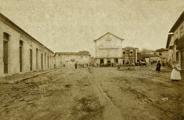 Não deixa de ser curioso o facto de a estrada que entra na Praça, pelo canto inferior direito da imagem – à época Estrada Real e hoje extremo norte da Rua Visconde – se apresentar ainda em terra batida. Se atentarmos na direção que cada uma delas toma, verificamos que as lajes daquilo que julgamos ser a estrada romana apontam para um trajeto que seguia pelo Largo de Santo António até ao Calvário, enquanto a Estrada Real aponta para um trajeto coincidente com a atual Rua Oliveira Júnior.