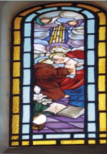 Como todos sabemos, a imagem de Santo António aparece sempre representada com o Menino Jesus ao colo, e o vitral exprime a entrega do Menino ao Santo pelas mãos de Maria, sua Mãe.