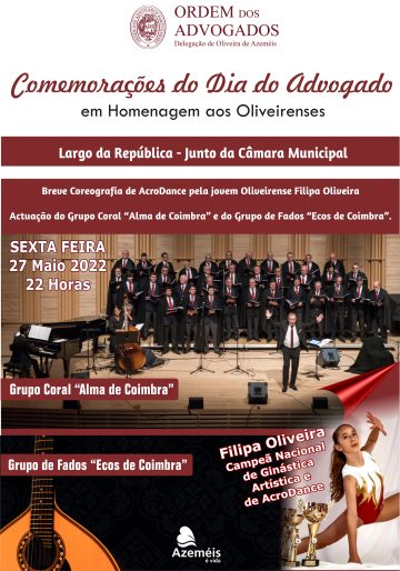 A Delegação da Ordem dos Advogados de Oliveira de Azeméis vai comemorar, na próxima sexta feira, 27 de Maio, pelas 22 horas, no largo fronteiro à Câmara Municipal, o Dia do Advogado com uma festa inédita no País, que é dedicada aos oliveirenses e que constará do programa seguinte: