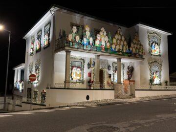 Está já toda engalanada a casa que todos os anos atrai olhares curiosos e visitas desbragadas, a fazer jus à fama de Casa do Pai Natal. Este ano, toda a decoração gira em torno da família do doutor Flores e de Maria José, em retratos da vida de um clã, minuciosos à imagem de cada elemento. Foi inaugurada, como reza a tradição, a 23 de novembro, dia do aniversário de Maria José. Quem por lá passar, poderá ver representadas todas as gerações desde que a casa foi edificada no alto de uma colina de S. João da Madeira no final dos anos 1920. São cinco gerações ao todo, 92 rostos humanos, dois cães, além do já típico Pai Natal a trepar para a chaminé.