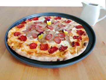 Haverá a opção com carne de lombo assado e paio de porco preto, salame com trufa, queijo de Ossela e no final após sair do forno leva queijo da ilha. A opção vegetariana a carne é substituída por chouriço vegano, cogumelos salteados, queijo de Ossela e no fim parmesão vegano. Por fim, uma pizza cem porcento vegana com queijo vegano, chouriço vegano, cogumelos salteados e após sair do forno também leva parmesão vegano. O parmesão vegano é feito n’A Tal da Pizza e os molhos de francesinha do Tudo aos Molhos não tem qualquer ingrediente animal. Na pizza vegetariana e vegana os cogumelos são de origem local, da produção de Ana Costa Vieira.